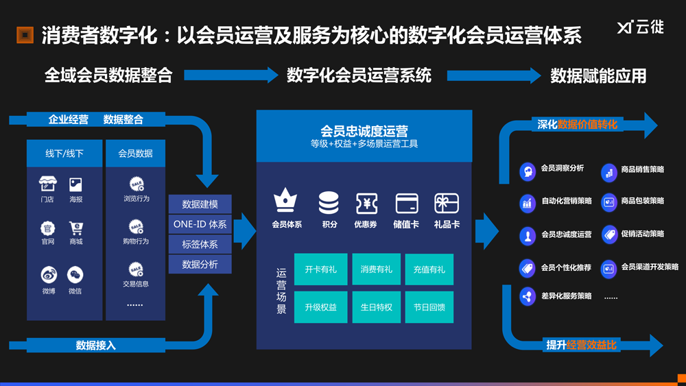 消费者数字化:从全域会员数据整合、数字化会员运营系统、数据赋能应用三个维度,构建以会员运营及服务为核心的数字化会员运营体系。