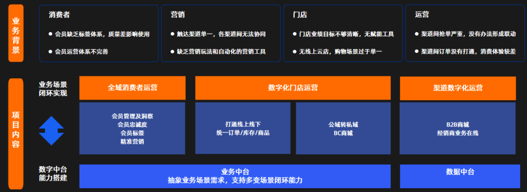 这个平台包括四个解决方案:渠道数字化解决方案,商品数字化解决方案,消费者数字化解决方案和门店数字化解决方案。