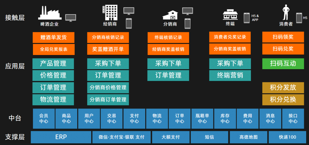 啤酒上市公司O2O1期项目,集团投入3亿打造O2O项目,整个项目分三期,第一期建设大B在线和链接C。第二期链接小B,第三期实现内部费控和内部管理升级。在项目建设的一期,Ebpay基于中台帮助企业建设了整个经销商B2B平台,实现经销商在线订货,返利兑现,回瓶等业务闭环。同时基于一物一码打造了数字化兑奖和积分商城运营。