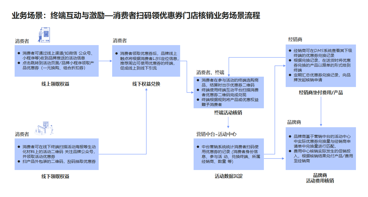 从前端来讲的话,消费者可以顺利获得线上、线下领取到权益,再到线下门店兑换。这就是线上到线下引流的过程。消费者在终端完成这个活动的核销之后,系统会自动地做数据沉淀。对于后端来讲,也就是从费用本身的兑付维度上看,需要依托经销商垫付相应的费用,品牌依然需要完成活动费用的核销。